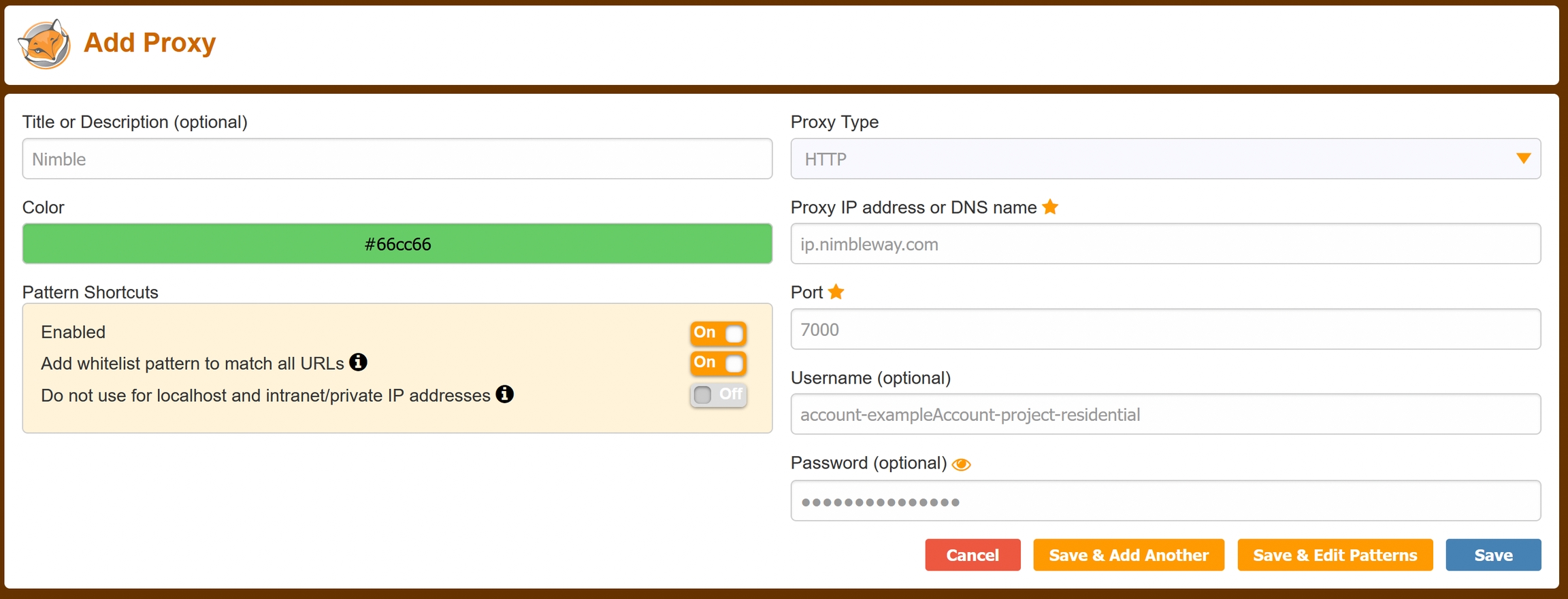 3. In the “Add Proxy” page, set a name for this proxy setup (we used Nimble), then enter the following details: