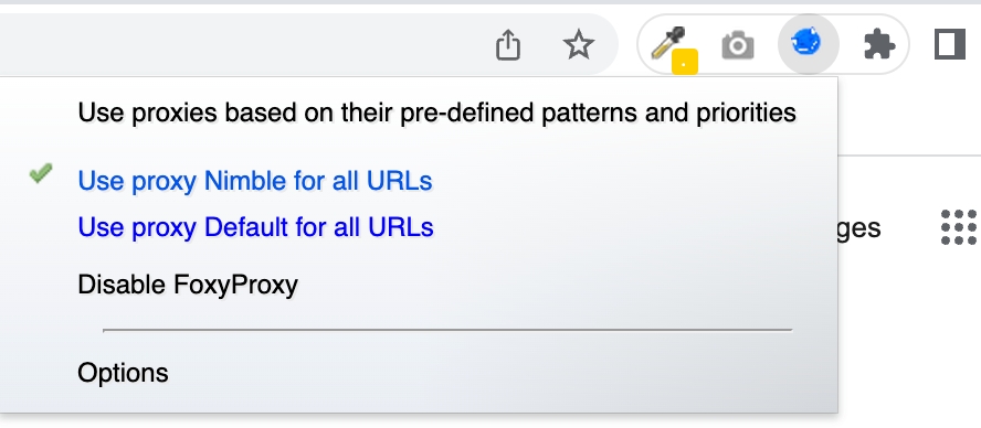 FoxyProxy is a simple and free browser extension that lets you easily use Nimble IP on Firefox or Chrome. While setting up your proxy server connection can be done without an extension, FoxyProxy provides a simple and flexible interface as well as additional options that browsers lack.