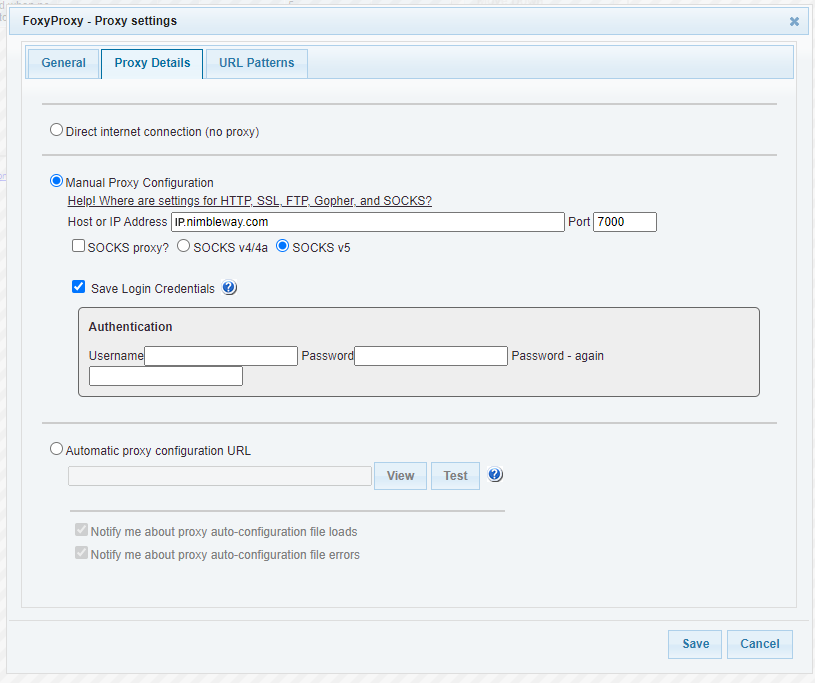 c. Check the option to “Save Login Credentials” (click ‘OK’ on the message that pops up, explaining how FoxyProxy handles usernames and passwords).