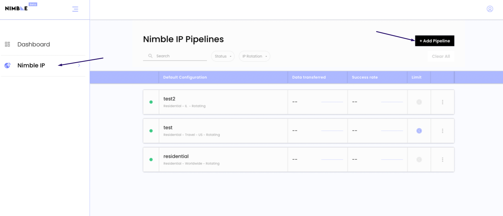 In the Nimble User Dashboard, navigate to the Nimble IP page and click “add pipeline”.