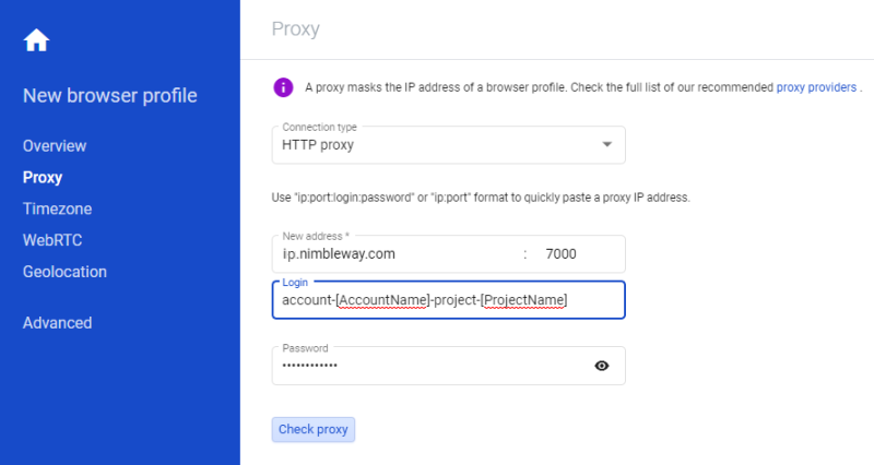 Before adding a proxy to your Multilogin profile, make sure you have a Nimble pipeline configured with the correct target country and IP rotation interval. Here is the information you will need for your Multilogin profile:
