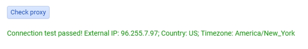 7. Click “Check proxy” to verify the setup was correct. You should see the external IP and country provided by Nimble appearing.