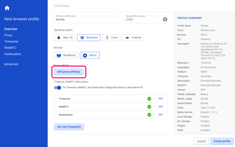 Note: Make sure to enable ‘Timezone, WebRTC and Geolocation fingerprints based on the external IP’ to ensure your profile works correctly with Nimble: