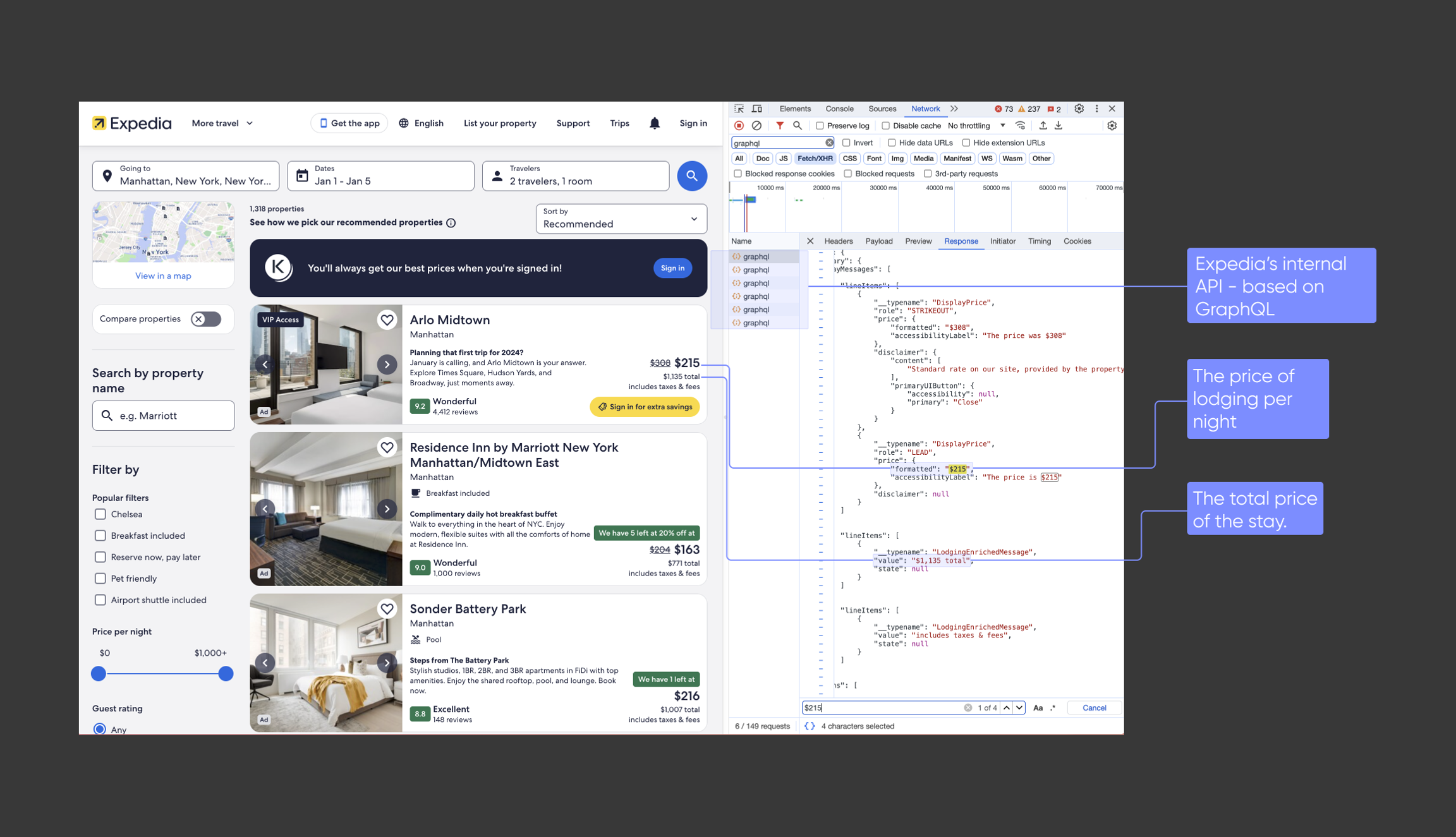 In the below example, we use Chrome's Developer Tools to demonstrate how Expedia loads data dynamically from an internal API: