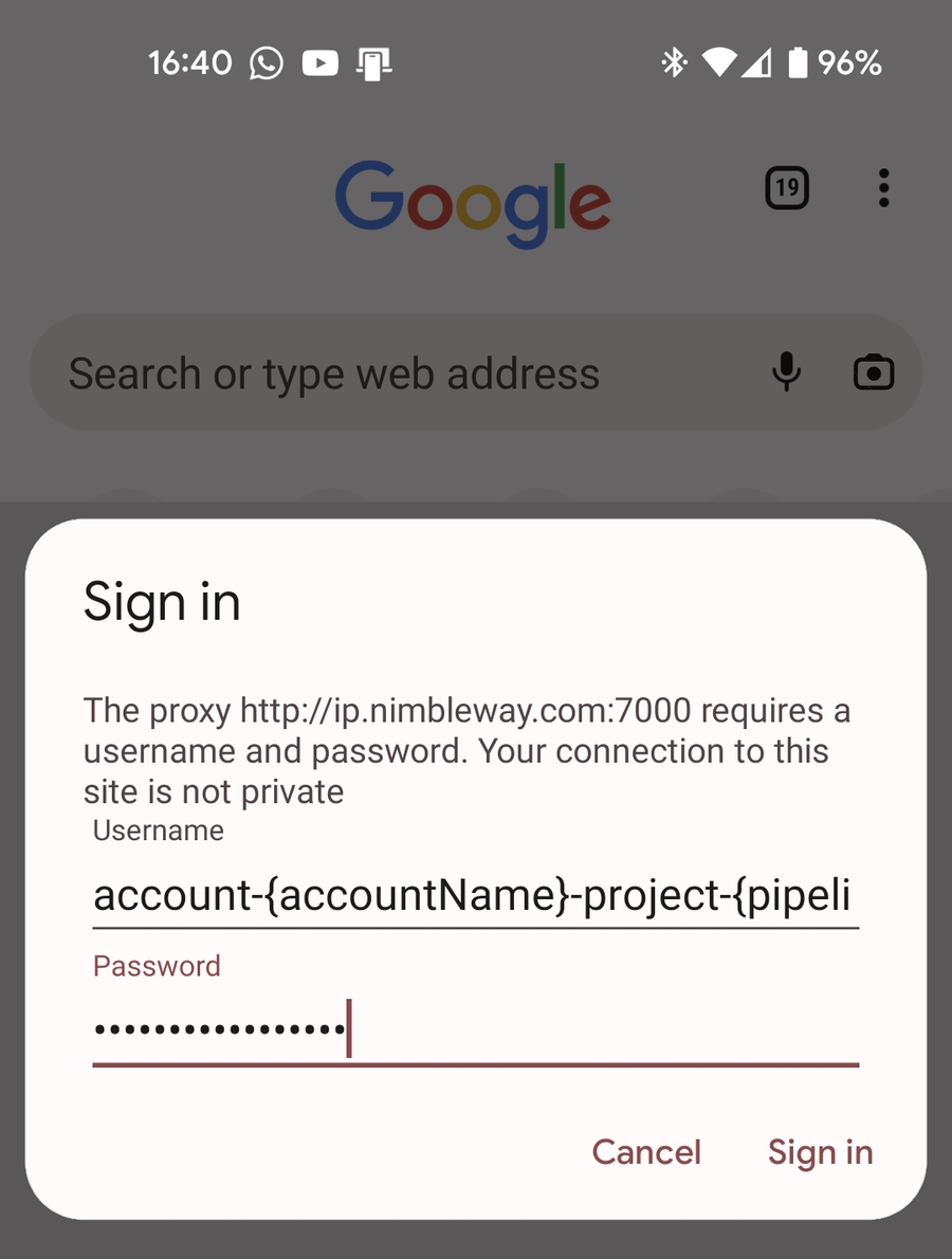 5. At this point, your phone will begin sending your requests through Nimble IP, but you still need to authenticate your device. To do so, open Chrome and browse to any website. You’ll immediately be asked to sign in with a username and password.